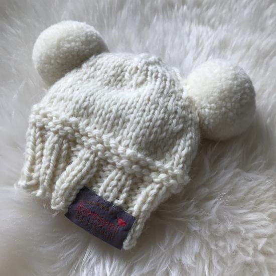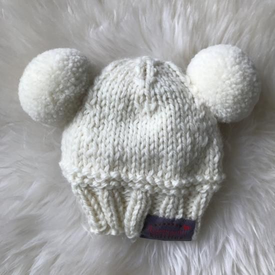 ポンポンが左右に2つ、くまちゃんのように付いているとても可愛い帽子です。