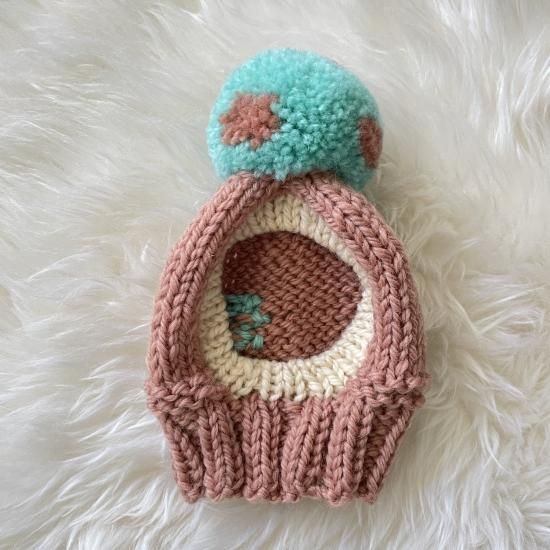 ワンちゃん用のBIGポポポーン帽。編み込み模様入りタイプです。