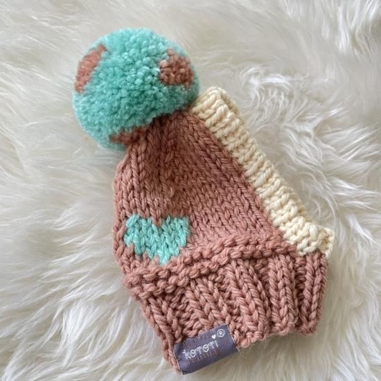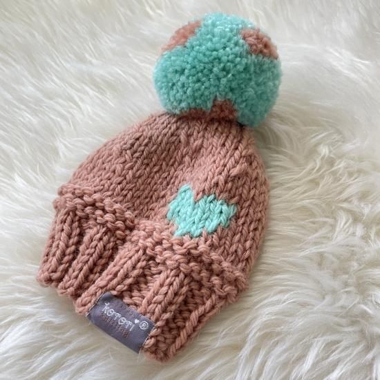 大きなポンポンの中にドット模様をあしらい、帽子本体にはハート模様を編み込みました。