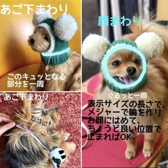 直接測るのは難しいので、商品サイズの顔まわりの長さで、メジャーで輪を作り、ワンちゃんのお顔にはめてみてください。