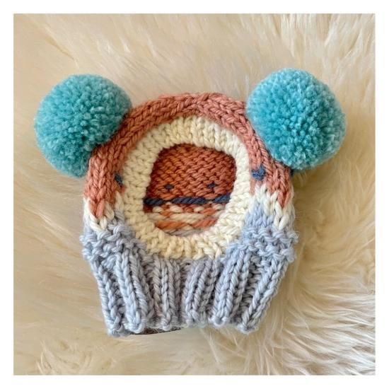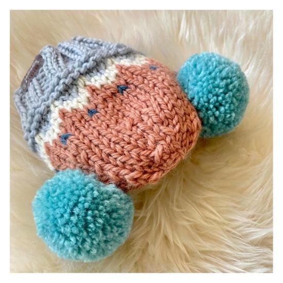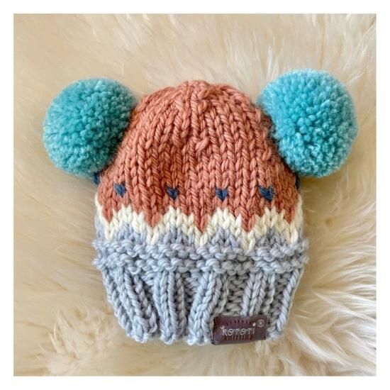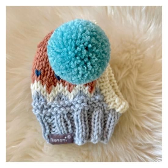 Wポポポーン帽編み込み模様入り crown付き ブルー×ミルクティー(耳穴なし)