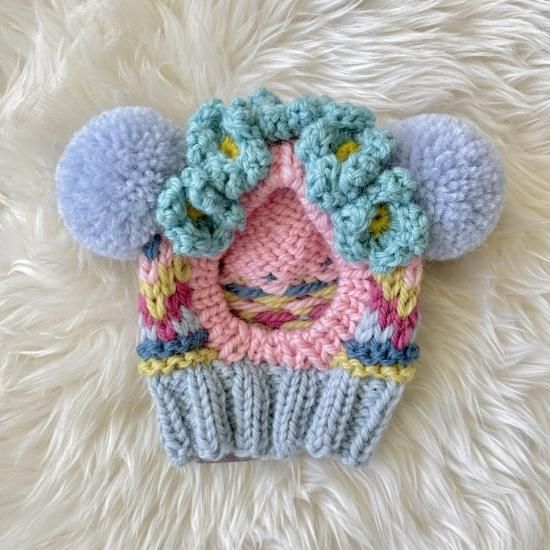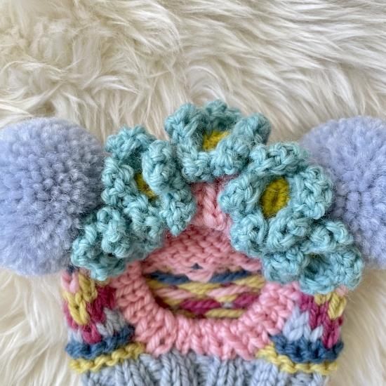 お顔の周りに手編みのお花を5つ、カチューシャのように縫い付けた、お花カチューシャバージョンが登場しました♪
