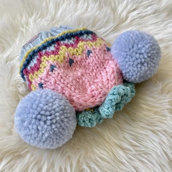 Wポポポーン帽編み込み模様ドットポンポンcrown付き イエロー×ライトピンク(耳穴なし)