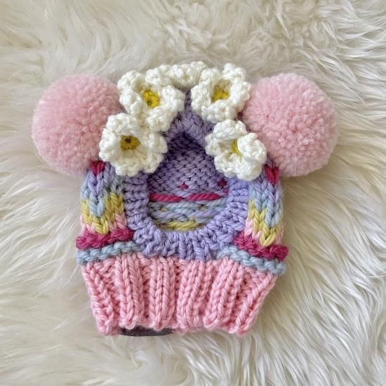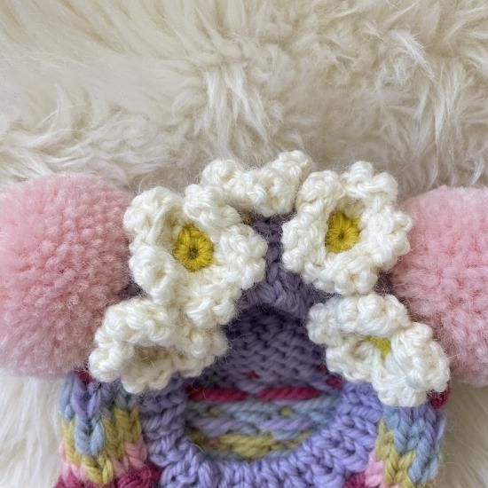 お顔の周りに手編みのお花を5つ、カチューシャのように縫い付けた、お花カチューシャバージョンが登場しました♪