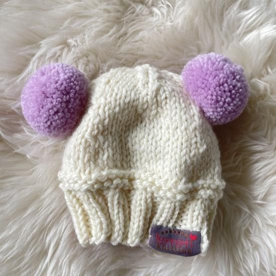 Wポポポーン帽 編み込み模様入り ライトパープル×ピーチ(耳穴なし)