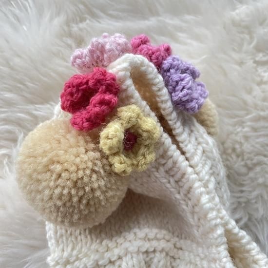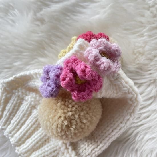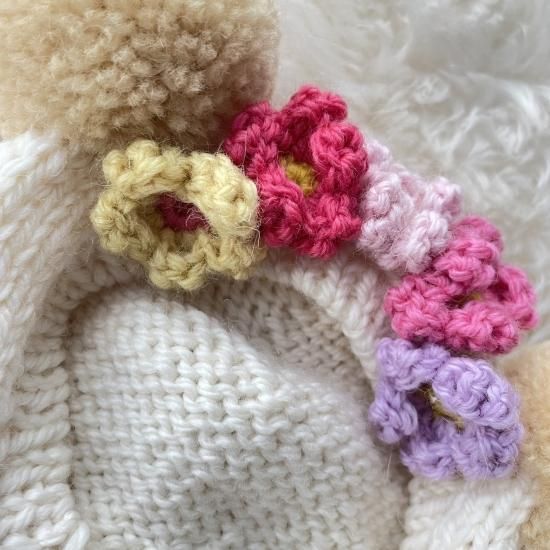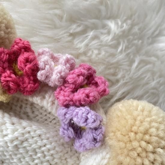 お顔のの周りに手編みのお花をゴージャスに5個縫い付けた、お花カチューシャバージョンが登場しました♪