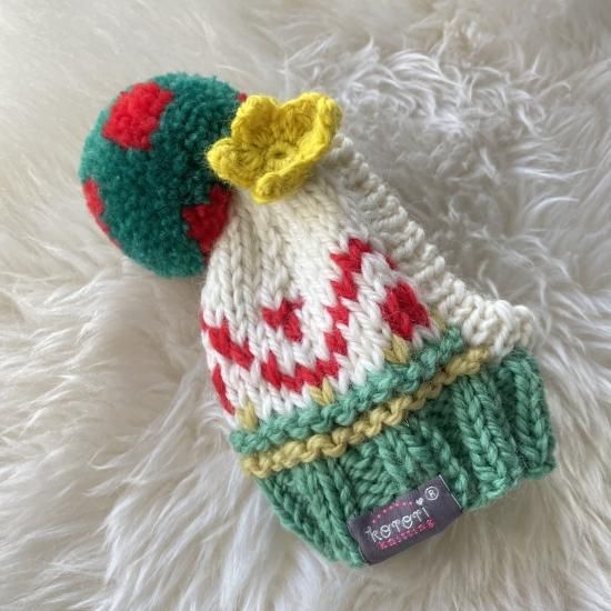 Wポポポーン帽編み込み模様ドットポンポンcrown付き イエロー×ライトピンク(耳穴なし)