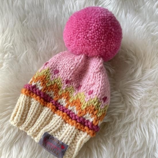 Wポポポーン帽編み込み模様入り crown付き イエロー×ピンク(耳穴なし)