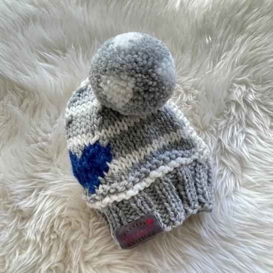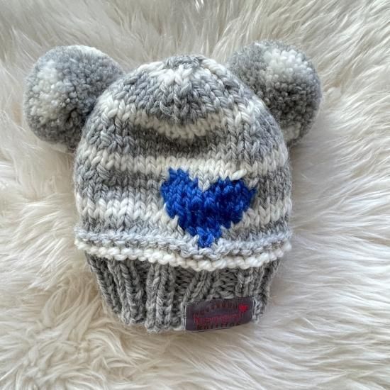 2つのポンポンの中にドット模様をあしらい、帽子本体にはボーダー模様とハート模様を編み込みました。