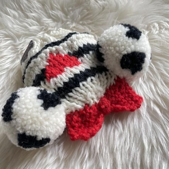 2つのポンポンの中にドット模様をあしらい、帽子本体にはボーダー模様とハート模様を編み込みました。