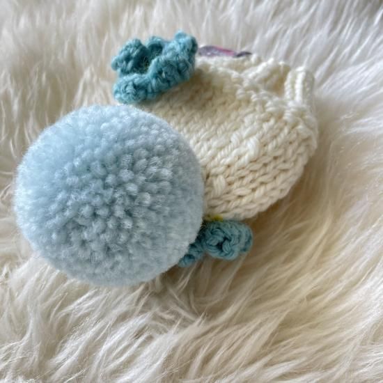 Wポポポーン帽編み込み模様入り crown付き ブルー×ミルクティー(耳穴なし)