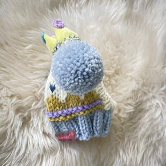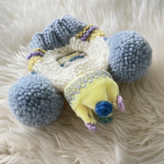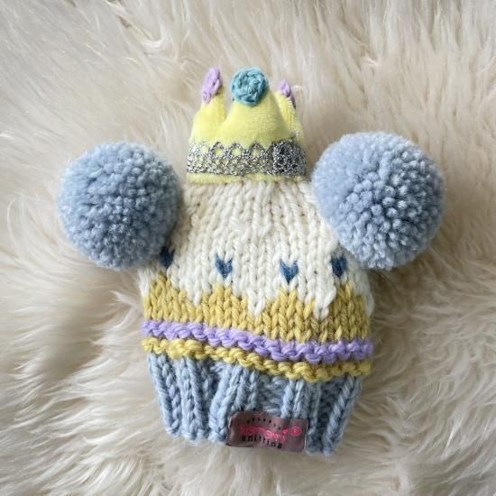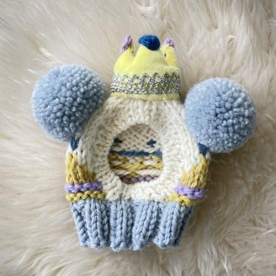 ふわふわのボア素材でお作りした王冠に、ラメのレースをぐるっと一周手縫し、冠の先に手編みの丸パーツを4つ縫い付けた、新作のcrown付きが登場しました♪