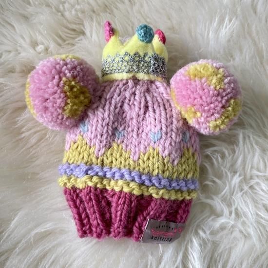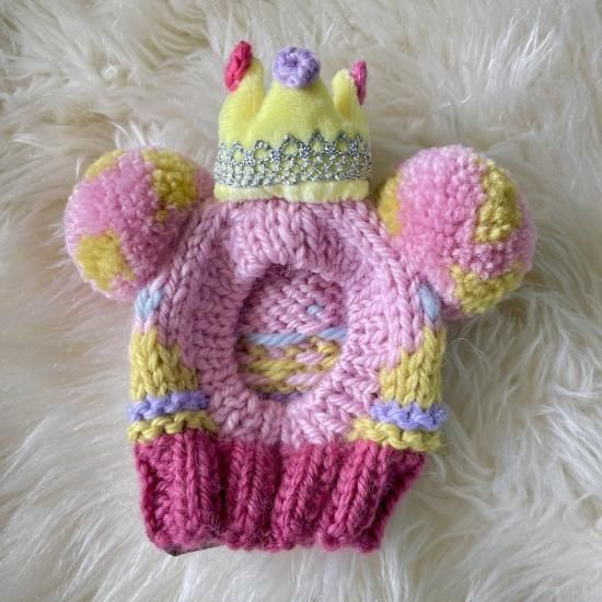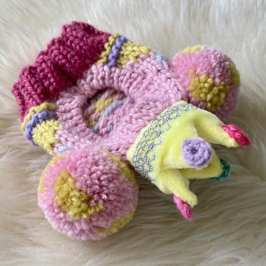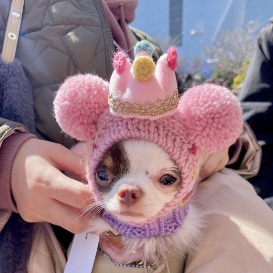 ふわふわのボア素材でお作りした王冠に、ラメのレースをぐるっと一周手縫し、冠の先に手編みの丸パーツを4つ縫い付けた、新作のcrown付きが登場しました♪