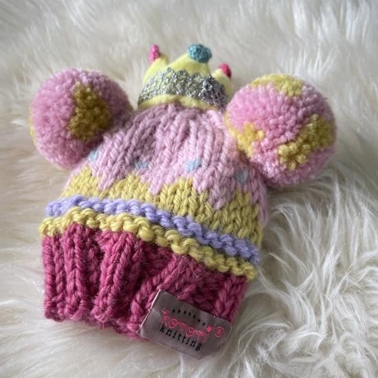Wポポポーン帽編み込み模様入り crown付き イエロー×ピンク(耳穴なし)