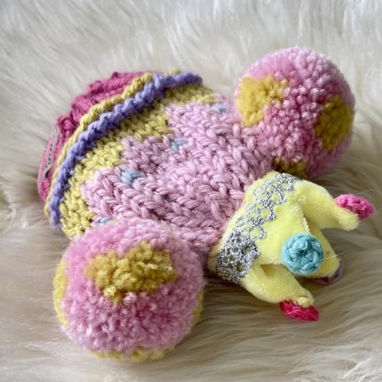 Wポポポーン帽編み込み模様ドットポンポンcrown付き イエロー×ライトピンク(耳穴なし)
