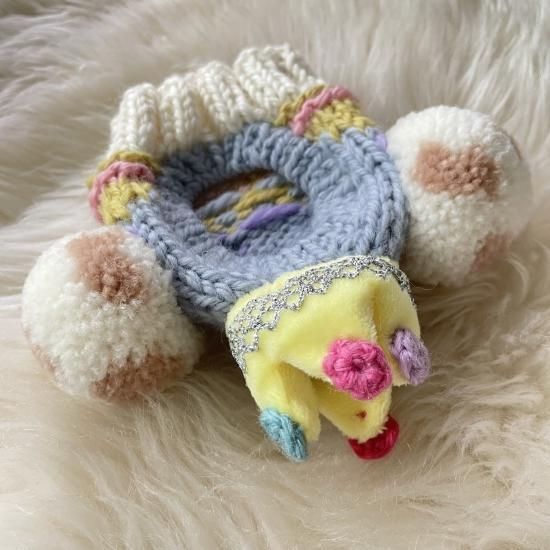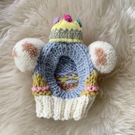 ふわふわのボア素材でお作りした王冠に、ラメのレースをぐるっと一周手縫し、冠の先に手編みの丸パーツを4つ縫い付けた、新作のcrown付きが登場しました♪
