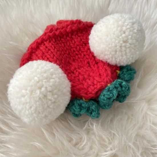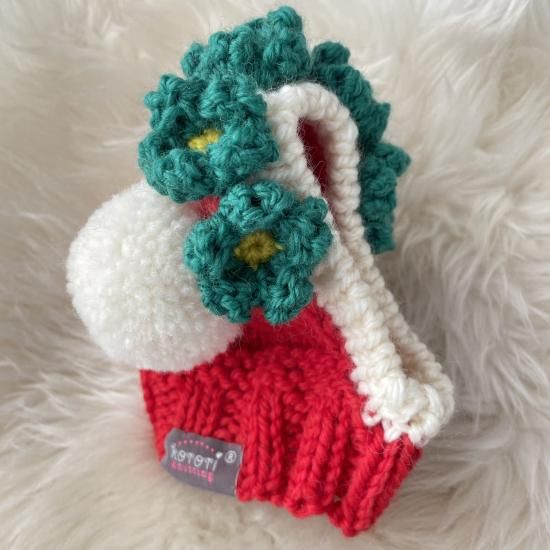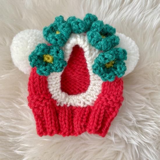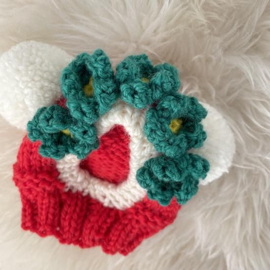 お顔の周りに手編みのお花を5つ、カチューシャのように並べて縫い付けた、お花カチューシャバージョンのクリスマスカラーが登場しました♪
