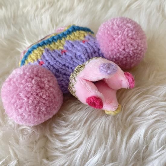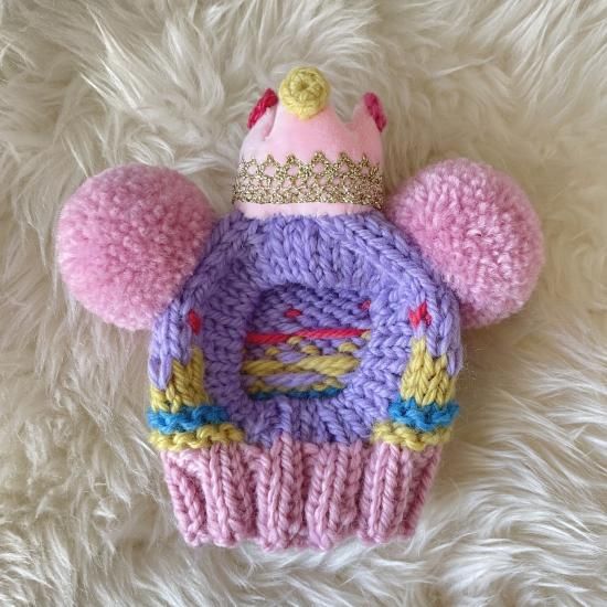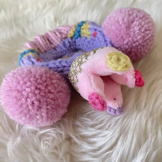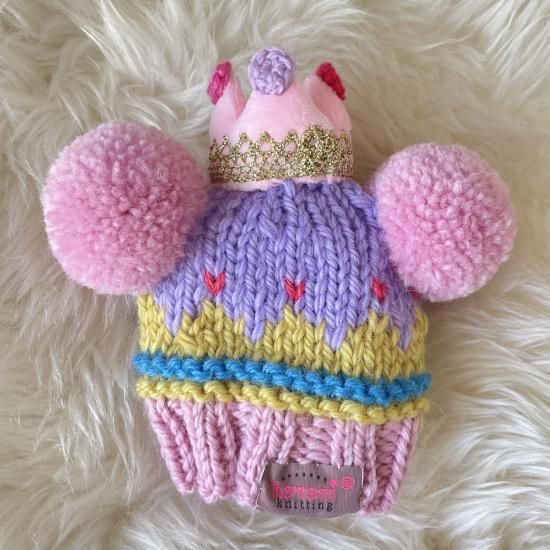 ふわふわのボア素材でお作りした王冠に、ラメのレースをぐるっと一周手縫し、冠の先に手編みの丸パーツを4つ縫い付けた、crown付きが登場しました♪