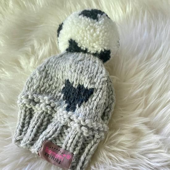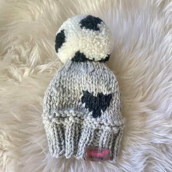 大きなポンポンが真ん中に1つ付いていて、ポンポンにはドット模様を入れ、頭の後ろにはハートの模様を編み込んだとても可愛い帽子です。