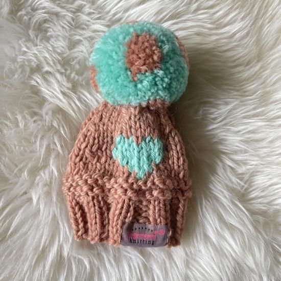 大きなポンポンが真ん中に1つ付いていて、ポンポンにはドット模様を入れ、頭の後ろにはハートの模様を編み込んだとても可愛い帽子です。