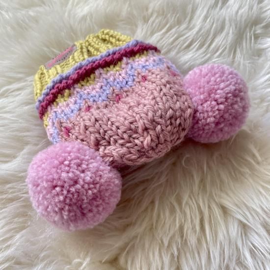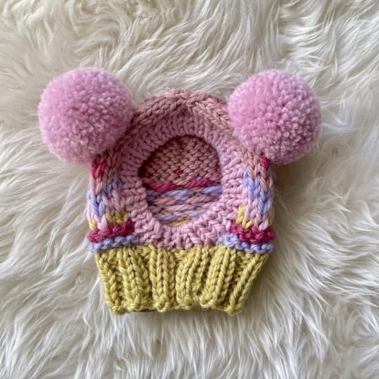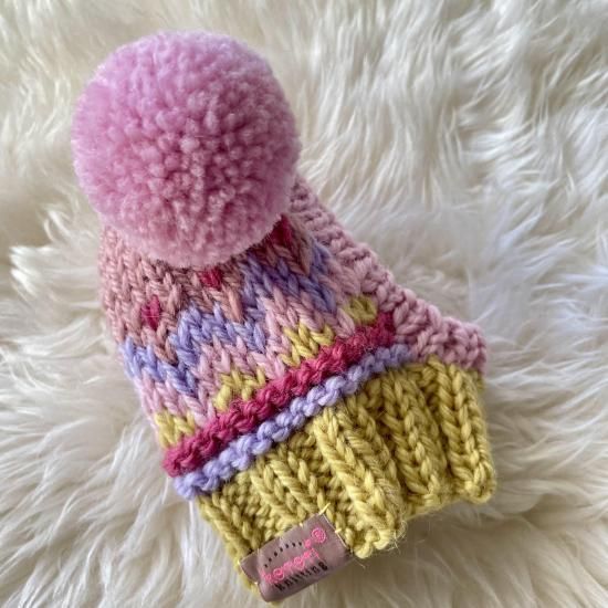 Wポポポーン帽編み込み模様ドットポンポンcrown付き イエロー×ライトピンク(耳穴なし)