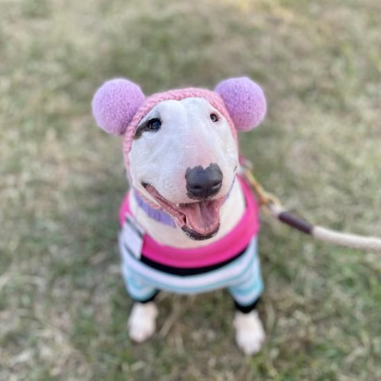 ワンちゃん用のBIGポポポーン帽。編み込み模様入りタイプです。