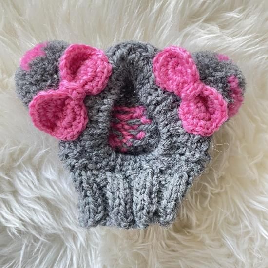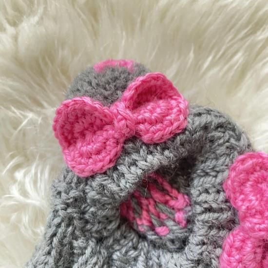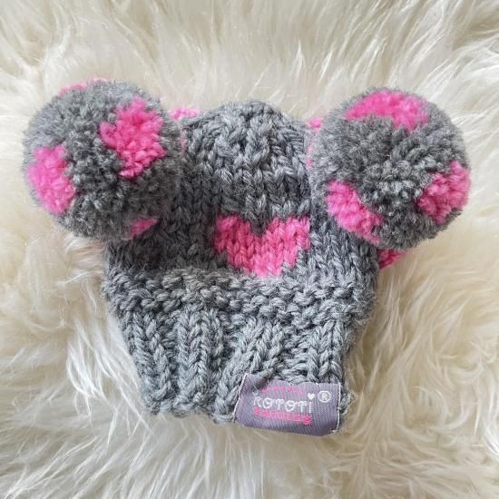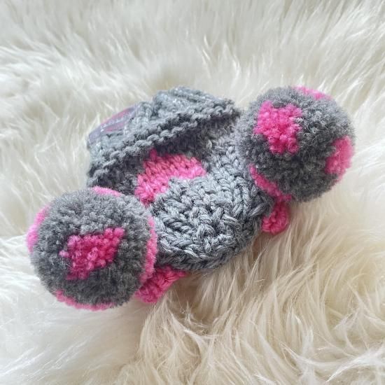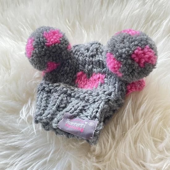 グレーのポンポンの中にピンクのドット模様を入れ、頭の後ろにハート模様を編み込みました♪