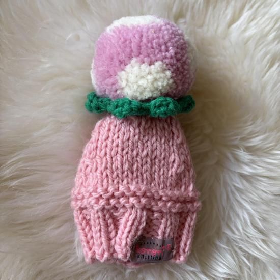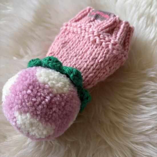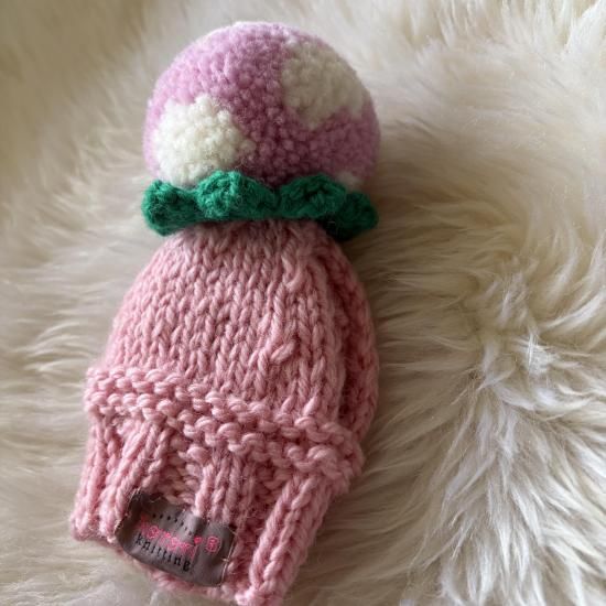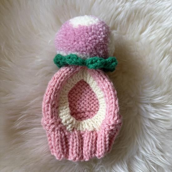 大きなポンポンの中にドット模様をあしらい、カギ編みでいちごのヘタをイメージして編み、ポンポンに挟み込み、いちごをイメージしてお作りしました。