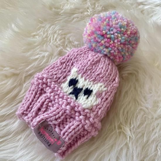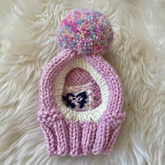 新作のミックスポンポン付きです!大きなミックスポンポンが真ん中に1つ付いていて、頭の後ろには白くまちゃんを編み込んだとても可愛い帽子です。