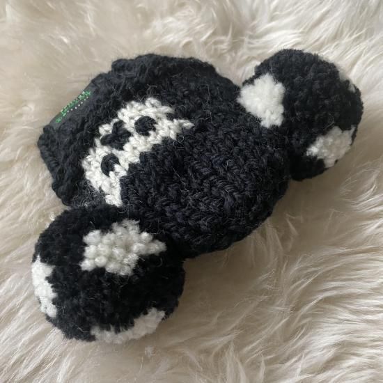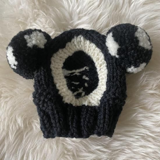 頭の後ろにくまちゃん柄を編み込み、その上から黒の毛糸でおめめとお鼻を刺繍しました♪おっきなおめめで見つめてくる白くまちゃんがとっても可愛いです。