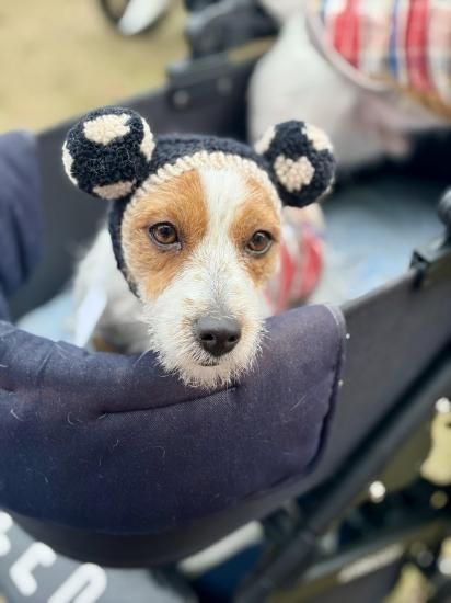 ワンちゃん用のBIGポポポーン帽。編み込み模様入りタイプです。