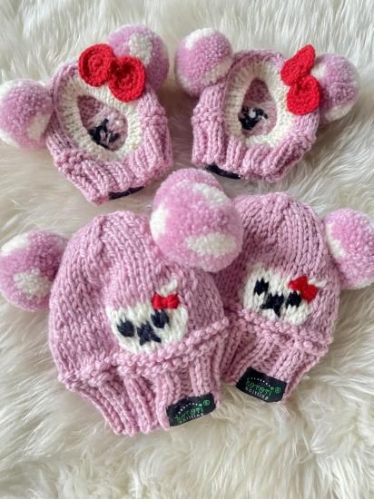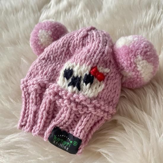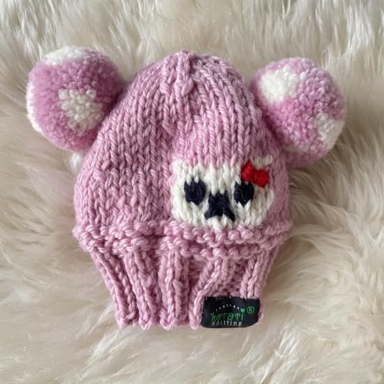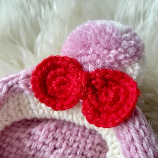 頭の後ろにくまちゃん柄を編み込み、その上から黒の毛糸でおめめとお鼻を刺繍しました♪白くまちゃんにもサイドにおリボンを刺繍じした。おっきなおめめで見つめてくる白くまちゃんがとっても可愛いです。