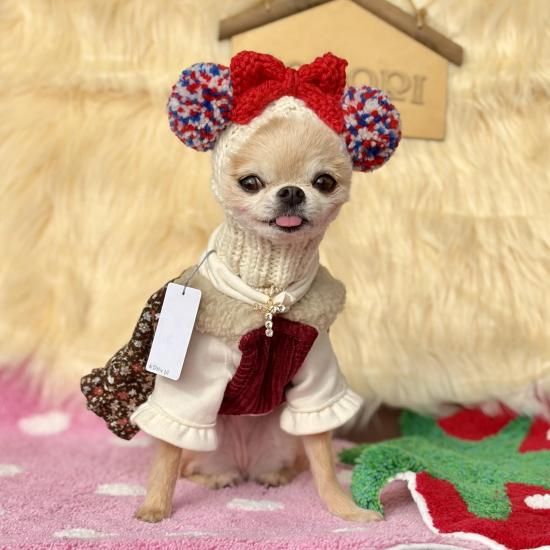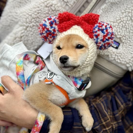 ワンちゃん用のWポポポーン帽ハートドットのリボン付きです。