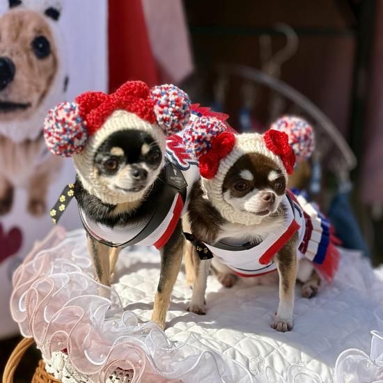 ワンちゃん用Wポポポーン帽。水玉蝶ネクタイ付きです。