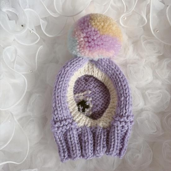 L Wポポポーン帽 編み込み模様入り ライトパープル×ピーチ(耳穴なし)