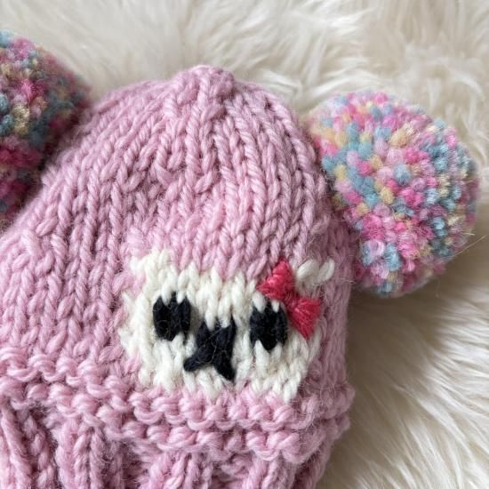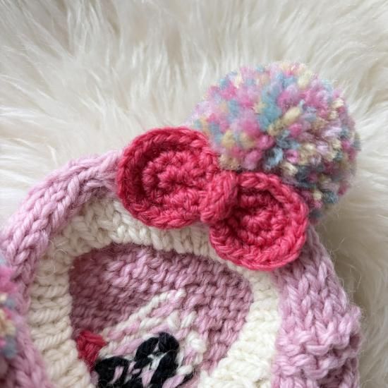 頭の後ろにくまちゃん柄を編み込み、その上から黒の毛糸でおめめとお鼻を刺繍しました♪白くまちゃんにもサイドにおリボンを刺繍しました。おっきなおめめで見つめてくる白くまちゃんがとっても可愛いです。