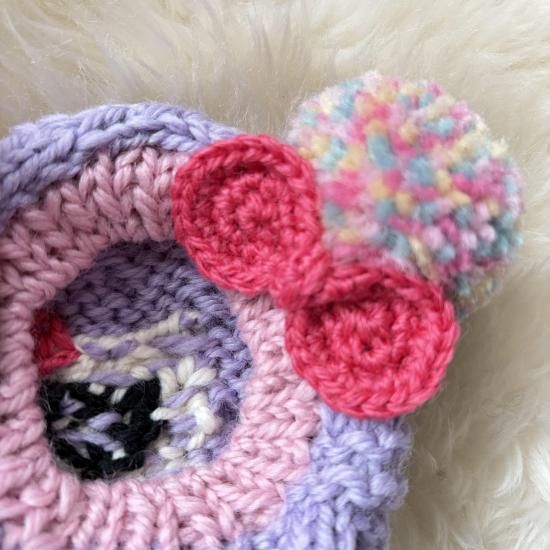 頭の後ろにくまちゃん柄を編み込み、その上から黒の毛糸でおめめとお鼻を刺繍しました♪白くまちゃんにもサイドにおリボンを刺繍しました。おっきなおめめで見つめてくる白くまちゃんがとっても可愛いです。