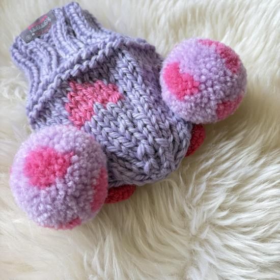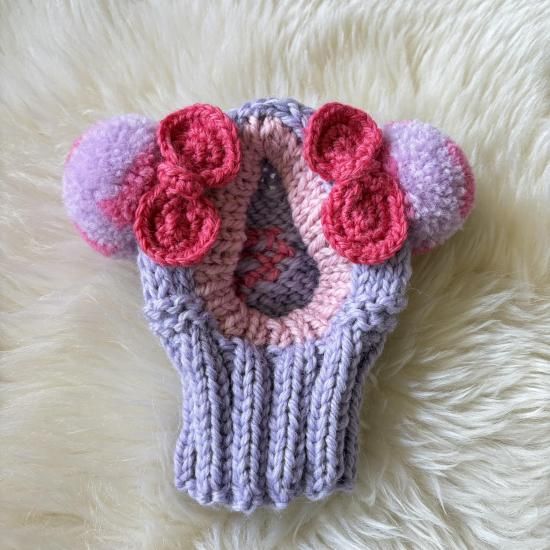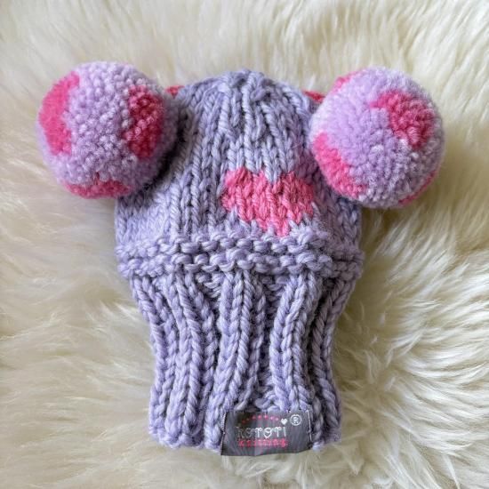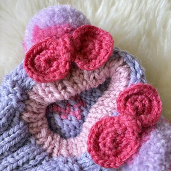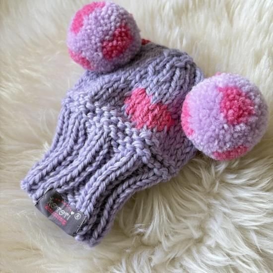 ライトパープルのポンポンの中にピンクのドット模様を入れ、頭の後ろにハート模様を編み込みました♪