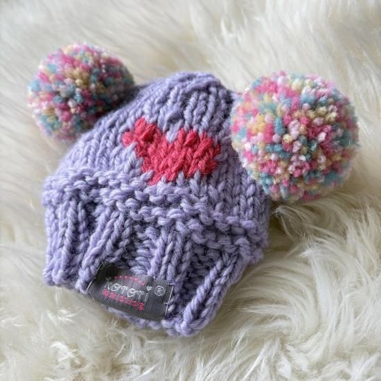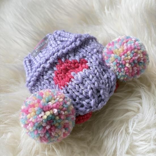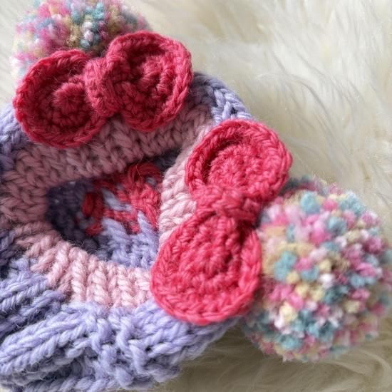 ポンポンにはドット模様を入れ、頭の後ろにはハート型の編み込み模様を入れました。