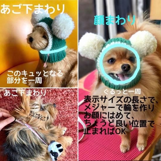 直接測るのは難しいので、商品サイズの顔まわりの長さで、メジャーで輪を作り、ワンちゃんのお顔にはめてみてください。